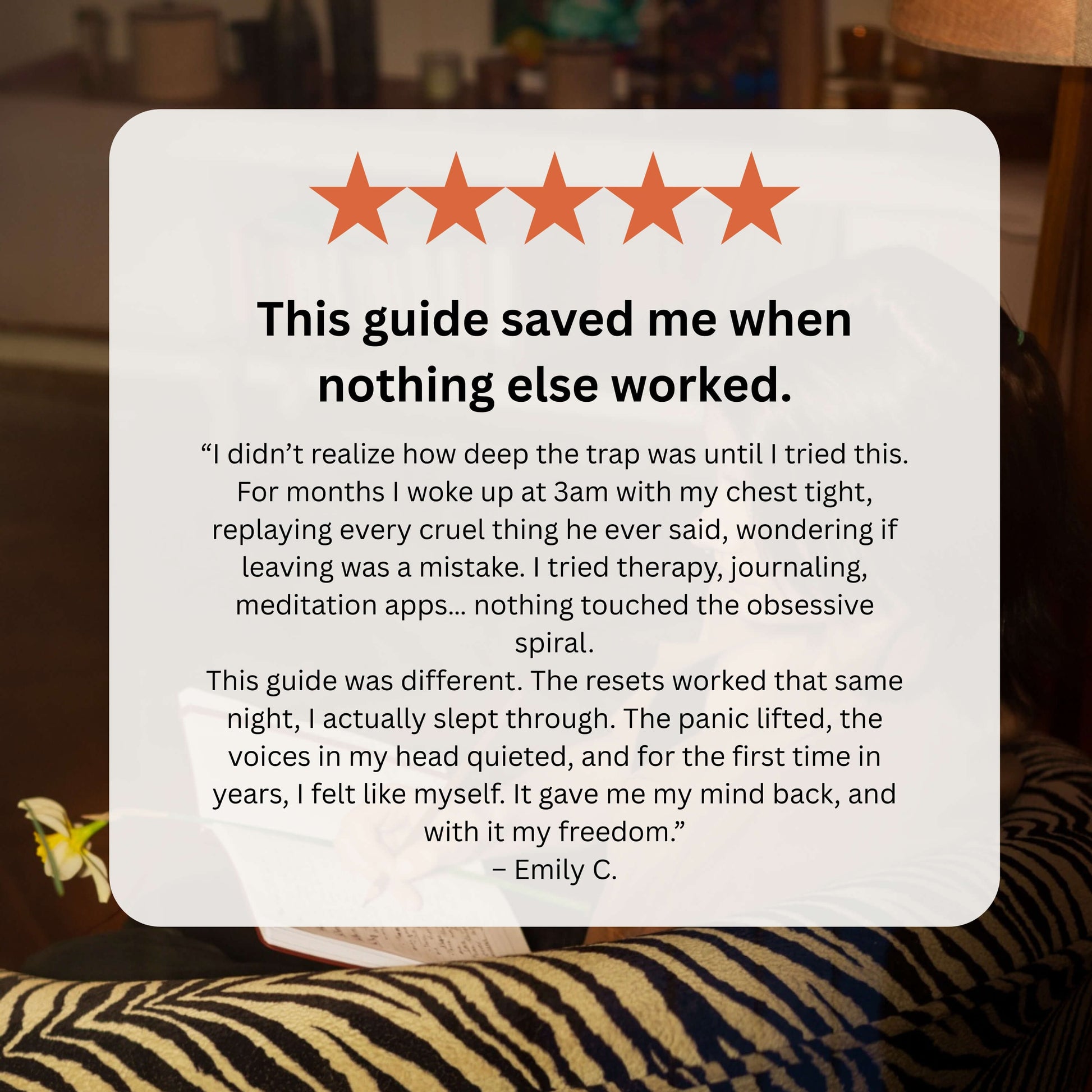 "Even after blocking him, I couldn’t stop thinking “what if?” at night. The daily exercises calmed me down and helped me sleep without the panic attacks. I wake up lighter instead of dreading the day."