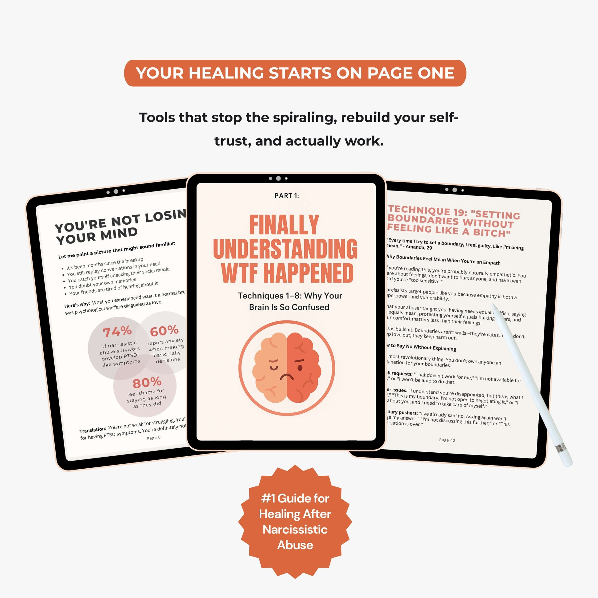 This guide is different because it’s short, direct, and written for the specific brain patterns created by narcissistic abuse. No fluff. Just tools that interrupt the spiral and rewire your responses, step by step.