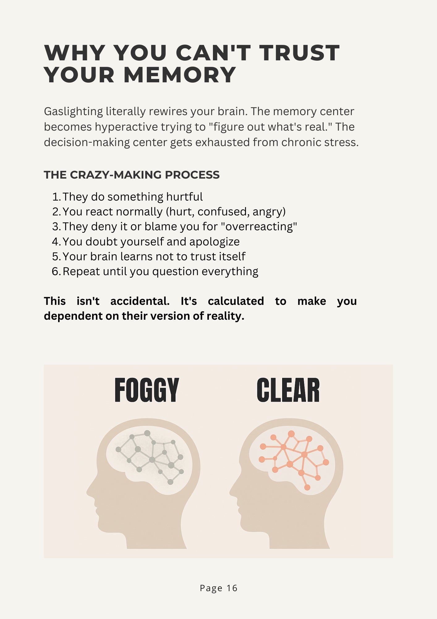 "I kept replaying every fight in my head wondering if I was the crazy one. The techniques helped me see the gaslighting for what it was and shut down that self-doubt spiral. It’s like I can breathe again."