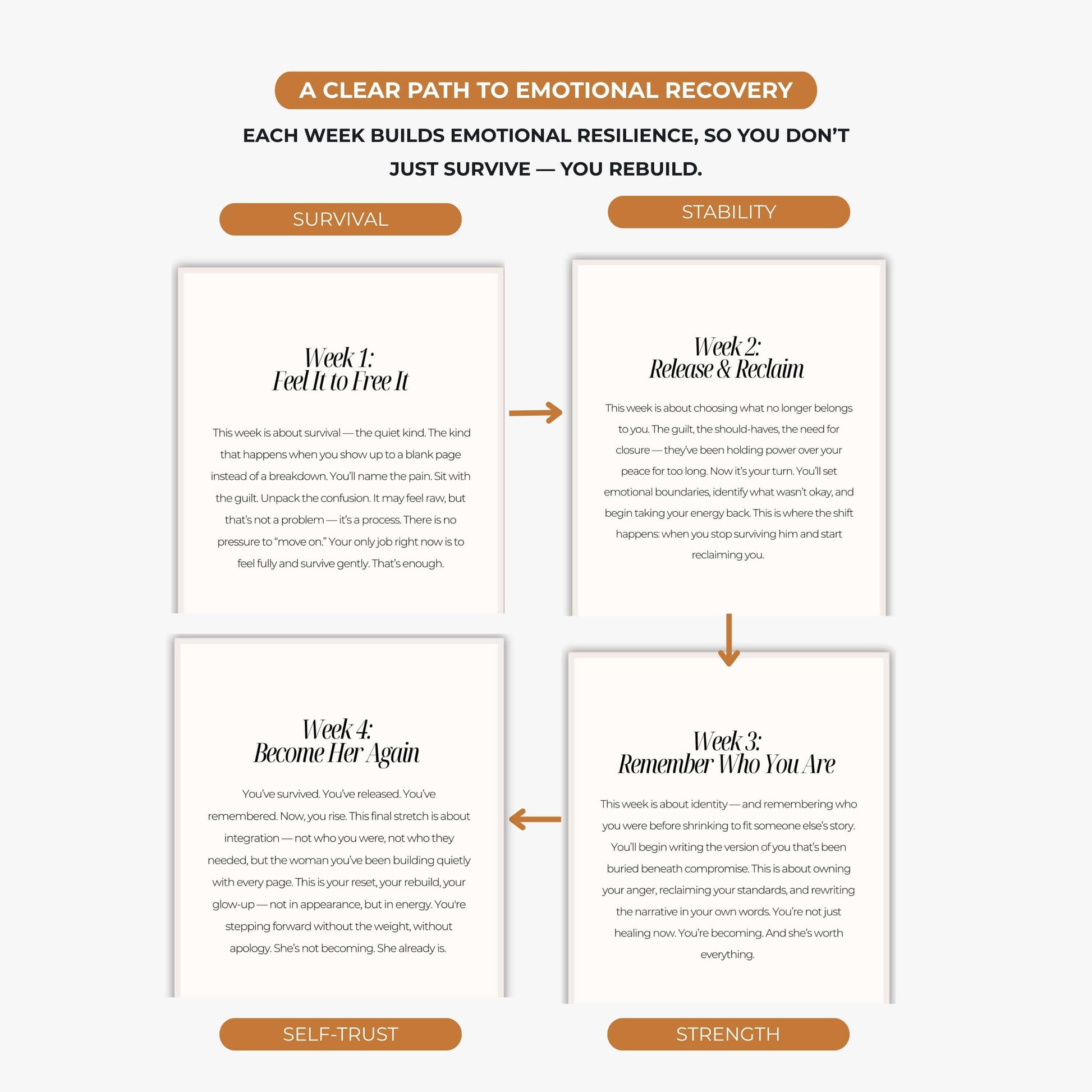 It’s structured to support you in the in-between moments: when you’re spiraling, tempted to text, or questioning what really happened.
