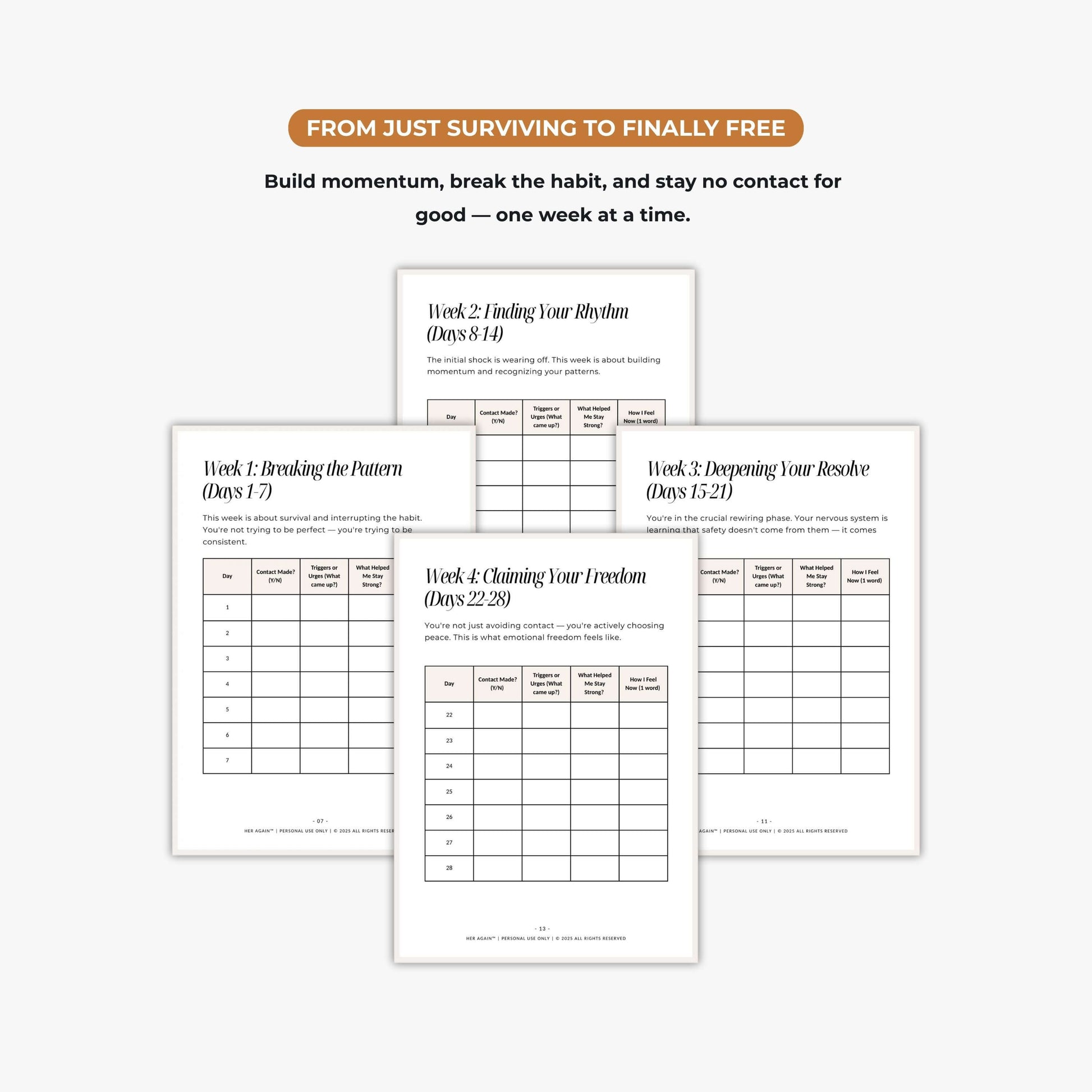 • Spend 10 minutes a day with the journal, complete the letter at your own pace, and use the tracker to stay no-contact and grounded